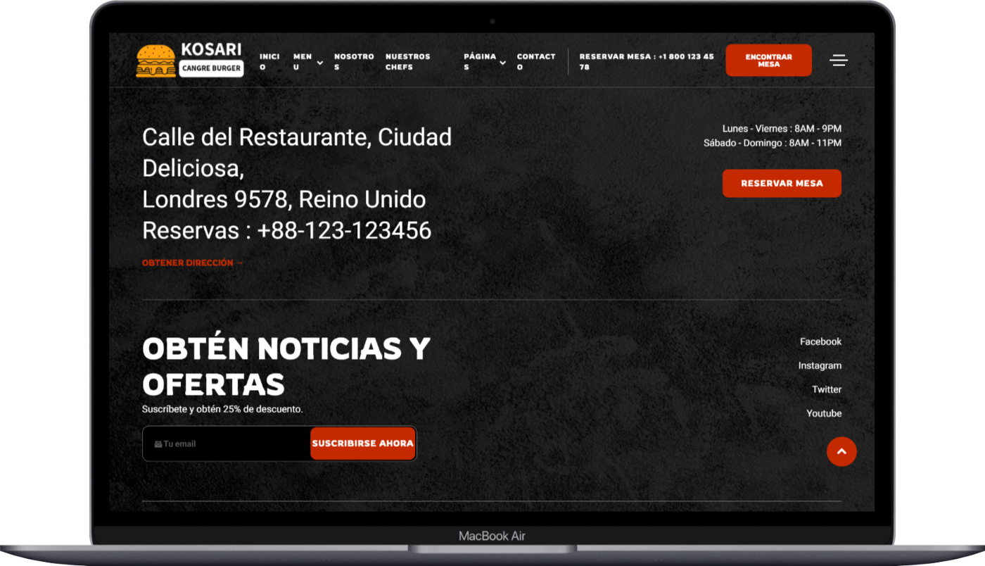 Cangre Burger es una plantilla HTML multipágina diseñada para restaurantes de carnes, hamburguesas, comida rápida, mariscos, bares, catering, negocios de comida