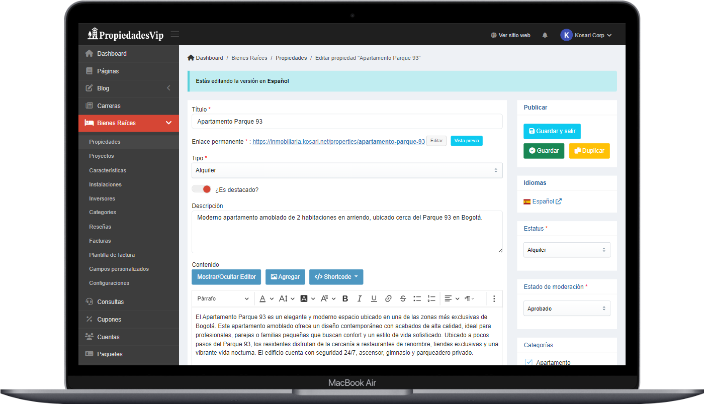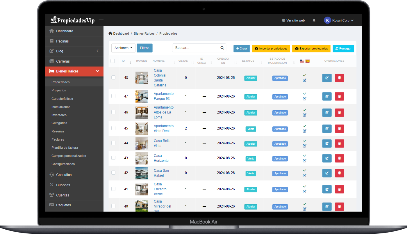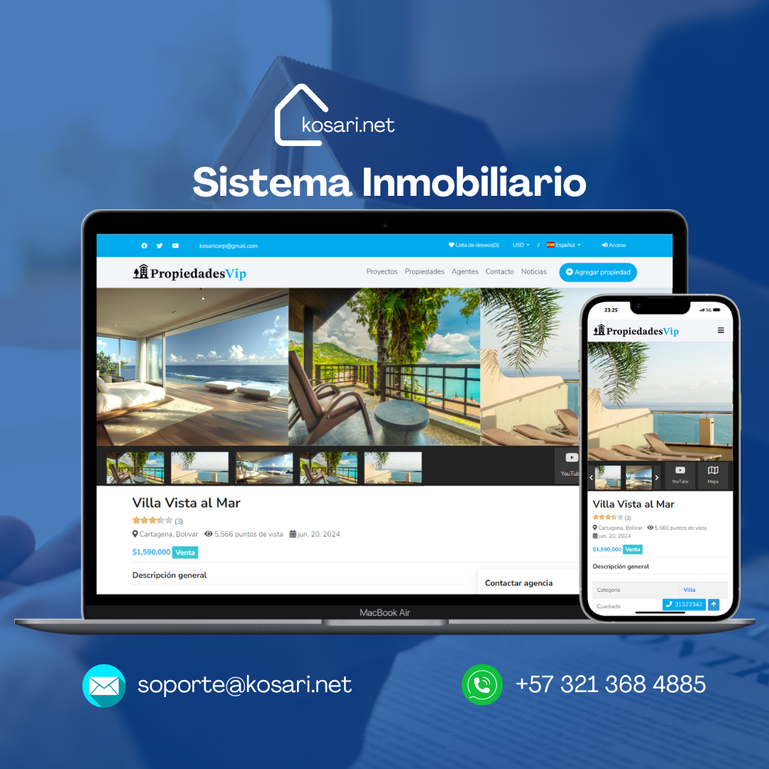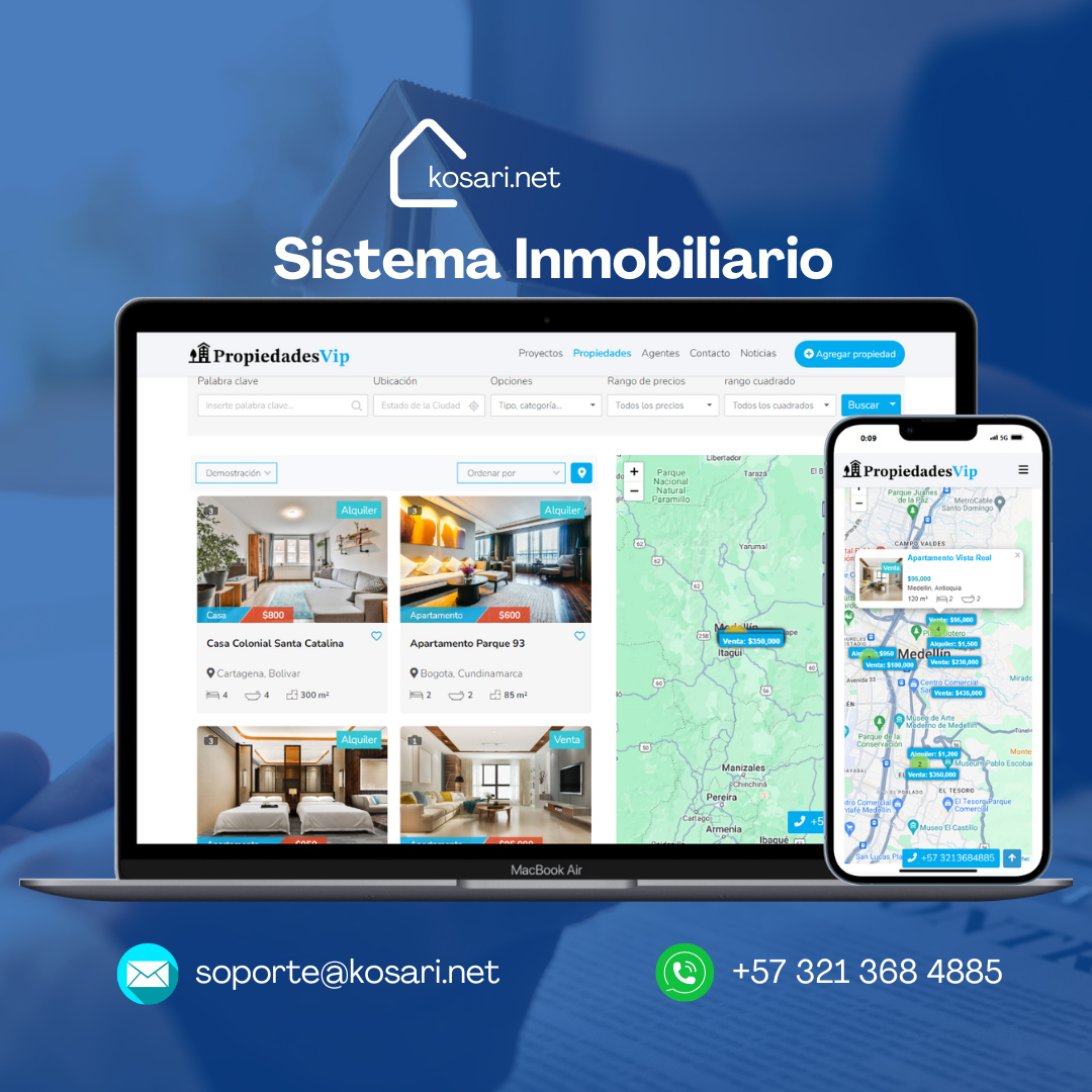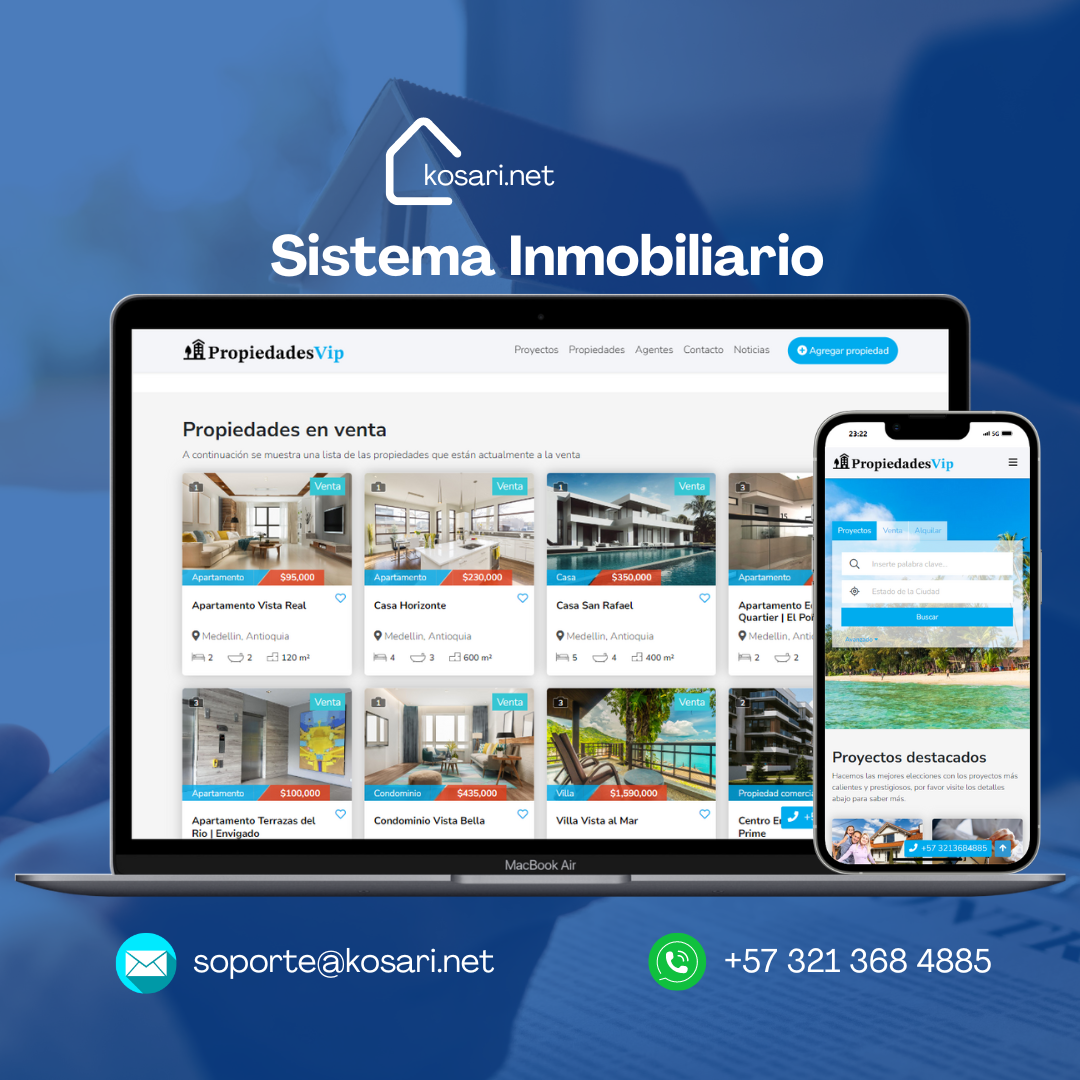 PropiedadesVIP es una plataforma completa y robusta diseñada para facilitar la venta y alquiler de propiedades de cualquier tipo. Ofrece un conjunto de módulos que cubren todas las necesidades de gestión de una inmobiliaria moderna, permitiendo una administración eficiente y centralizada de todas las operaciones inmobiliarias.