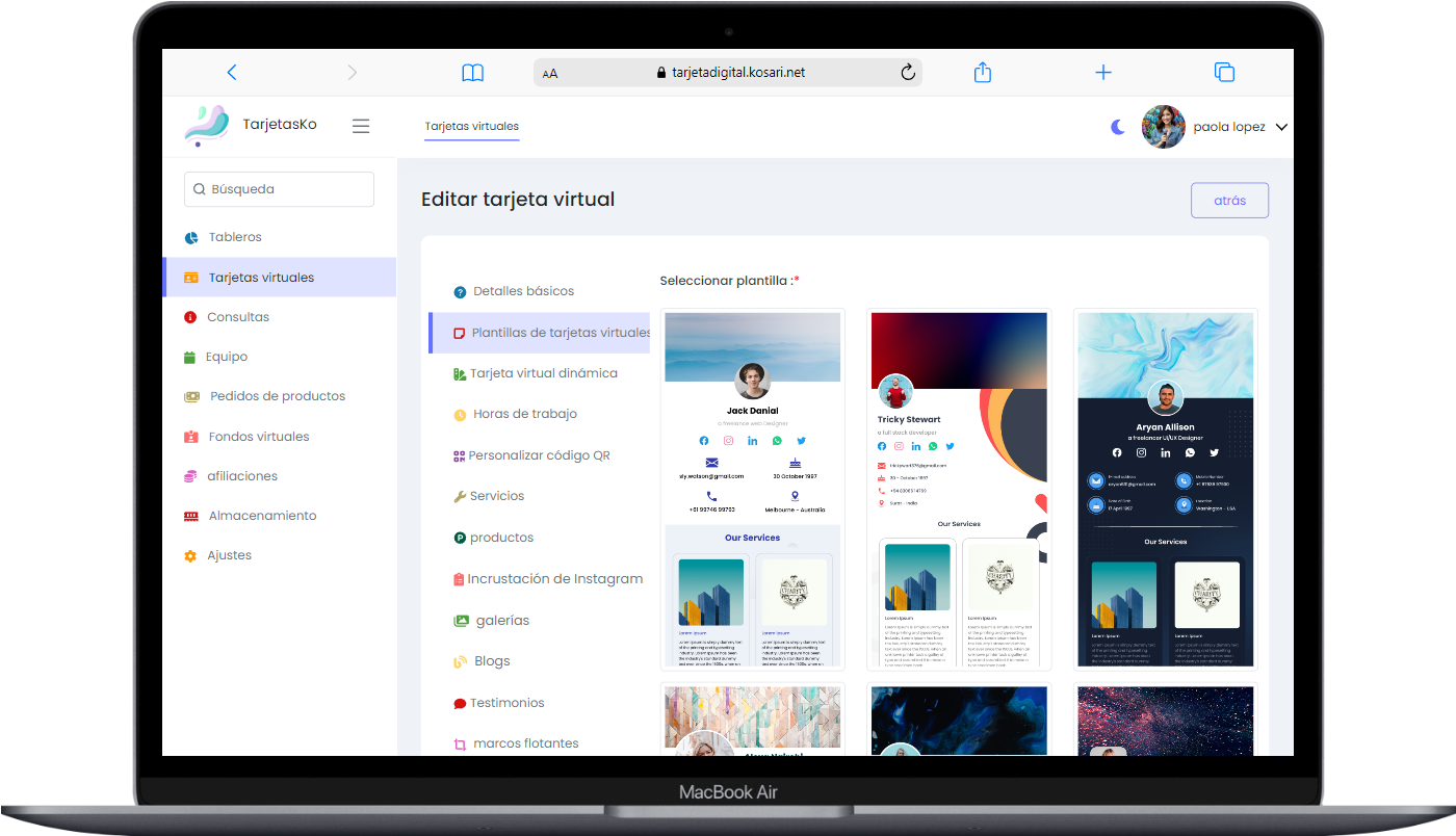 El administrador puede ver las plantillas TarjetasKo predeterminadas aquí. En este momento estamos ofreciendo 30 atractivas plantillas TarjetasKo.